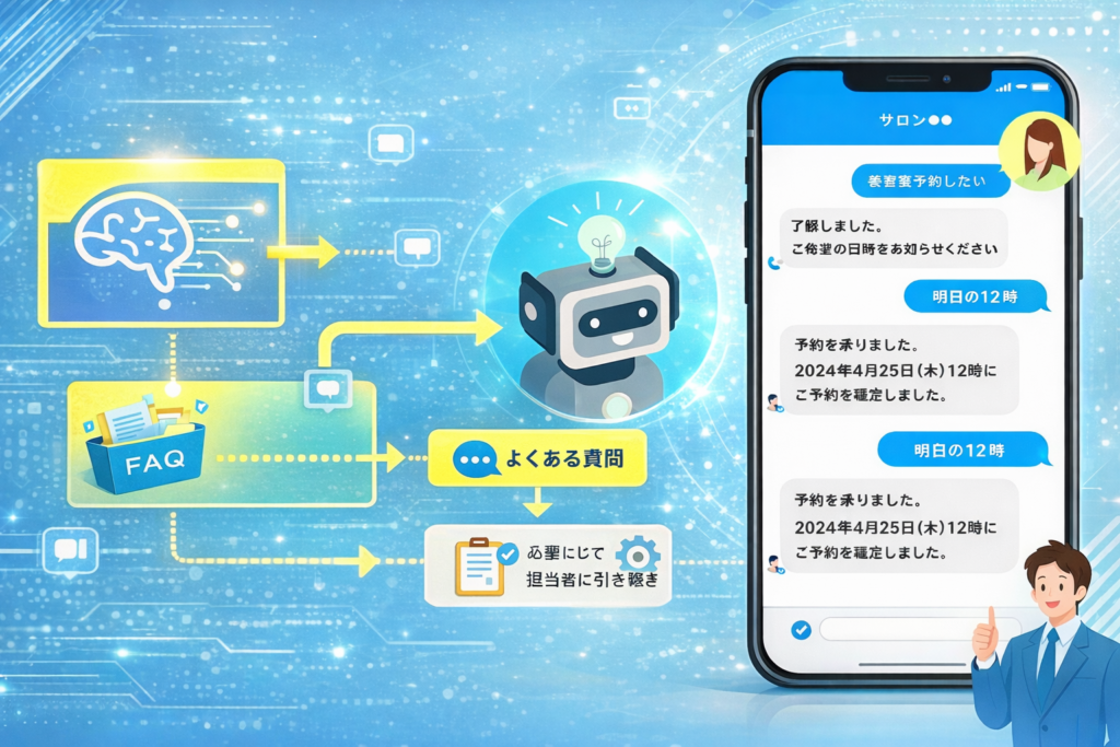 よくある質問への回答、予約ページへの案内、必要な情報の事前ヒアリングなどを自動化することで、